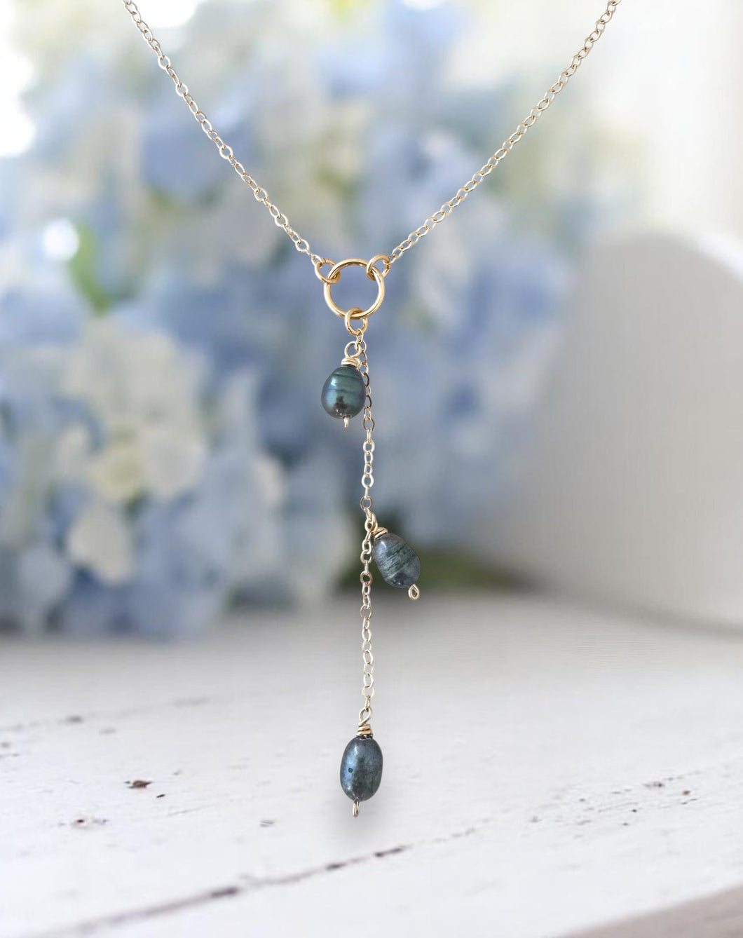 This simple Y necklace features three white luminous pearls that hangs from a long 14k gold filled chain suspended from a ring, adjustable chain.